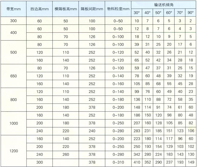 DJ型大大傾角波形擋邊帶式輸送機(jī)能力(帶速1m/s) (m3//h)